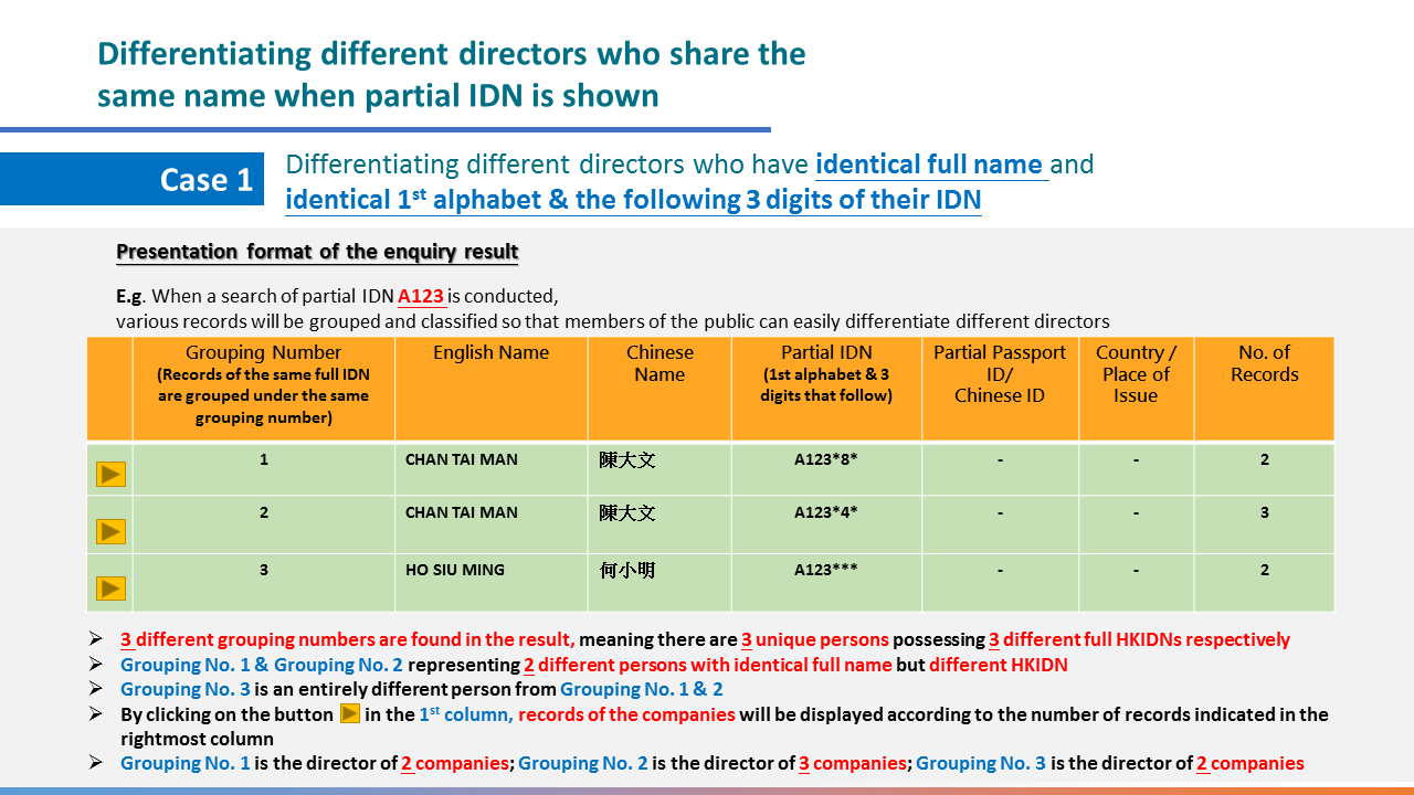 As we have clarified earlier, the public will be able to obtain the correspondence addresses and partial IDN of a director under the new inspection arrangement. Together with the full name of a director, it should be enough for identification in most of the cases. However, in some extremely rare cases when different directors have identical full names and partial IDN, extra digit of their identity card numbers will be provided for effective identification and differentiation.