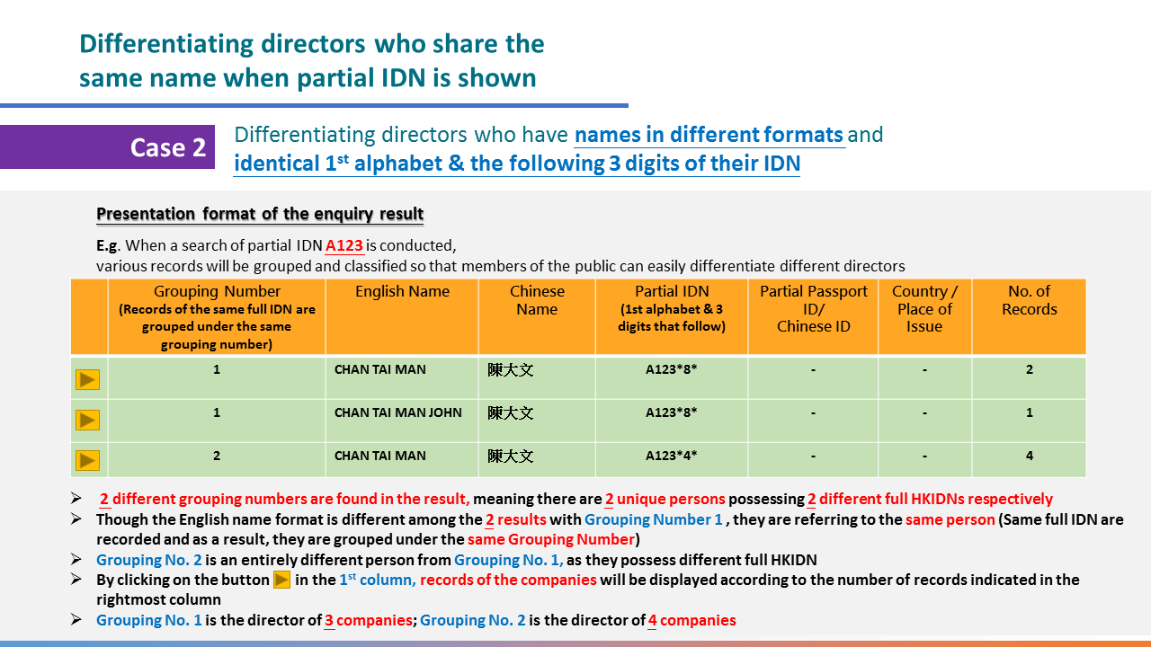 In addition to providing information about individual company directors, the Companies Register also helps members of the public identify cross-directorship. We understand that identifying cross-directorship serves a wide range of purposes. In financial and business transactions, it is useful in making assessment pertaining to connected transactions, while in claims involving employees’ rights, it enables workers to know if their employers are directors of multiple companies. Under the new inspection arrangement, we will process and consolidate the director information through which even with partial IDN, members of the public can easily tell whether cross-directorship is involved when making searches. It is a comparable alternative to the use of a unique director identification number as proposed by some industry associations, allowing identification of cross-directorship by members of the public without displaying the full IDN of a director.