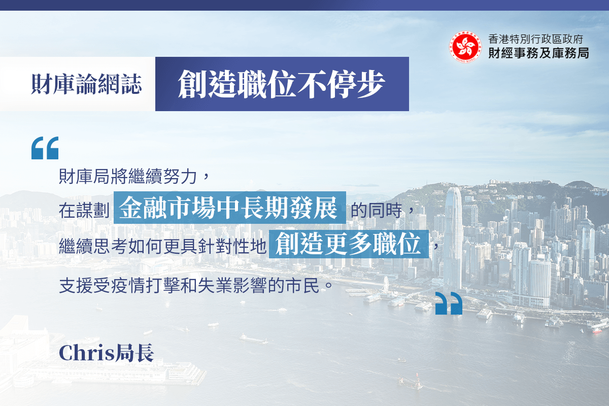 财政司司长上周三公布了2021至22年度《财政预算案》,当中建议增拨66亿元,再创造约30,000个不超过十二个月的有时限职位。就此,财库局将继续努力,在谋划金融市场中长期发展的同时,继续思考如何更具针对性地创造更多职位,支援受疫情打击和失业影响的市民。