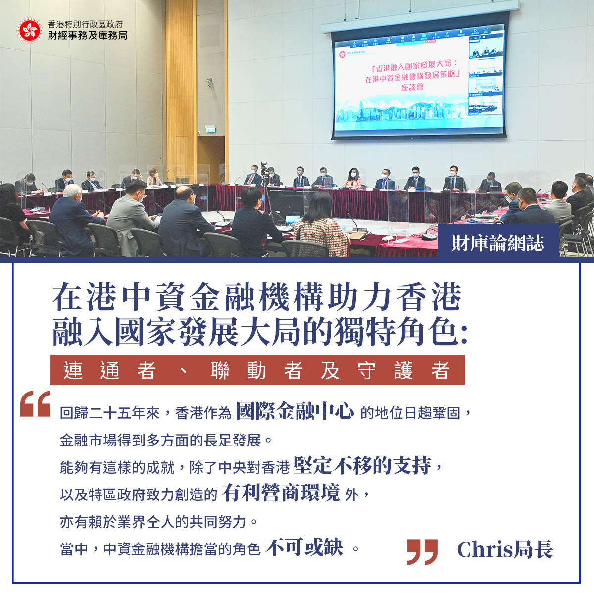 财库局于上周四举办了「香港融入国家发展大局 在港中资金融机构发展策略」座谈会,在中联办经济部部长孙湘一及各金融监管机构代表参与下,邀请了二十多位来自在港中资金融行业协会、银行、券商、投资银行、基金及保险业翘楚济济一堂,就未来市场发展,特别是香港如何更好地融入国家发展大局提出政策建议。各代表分享了不少真知灼见,将会成为财库局日后政策及发展策略的重要参考。