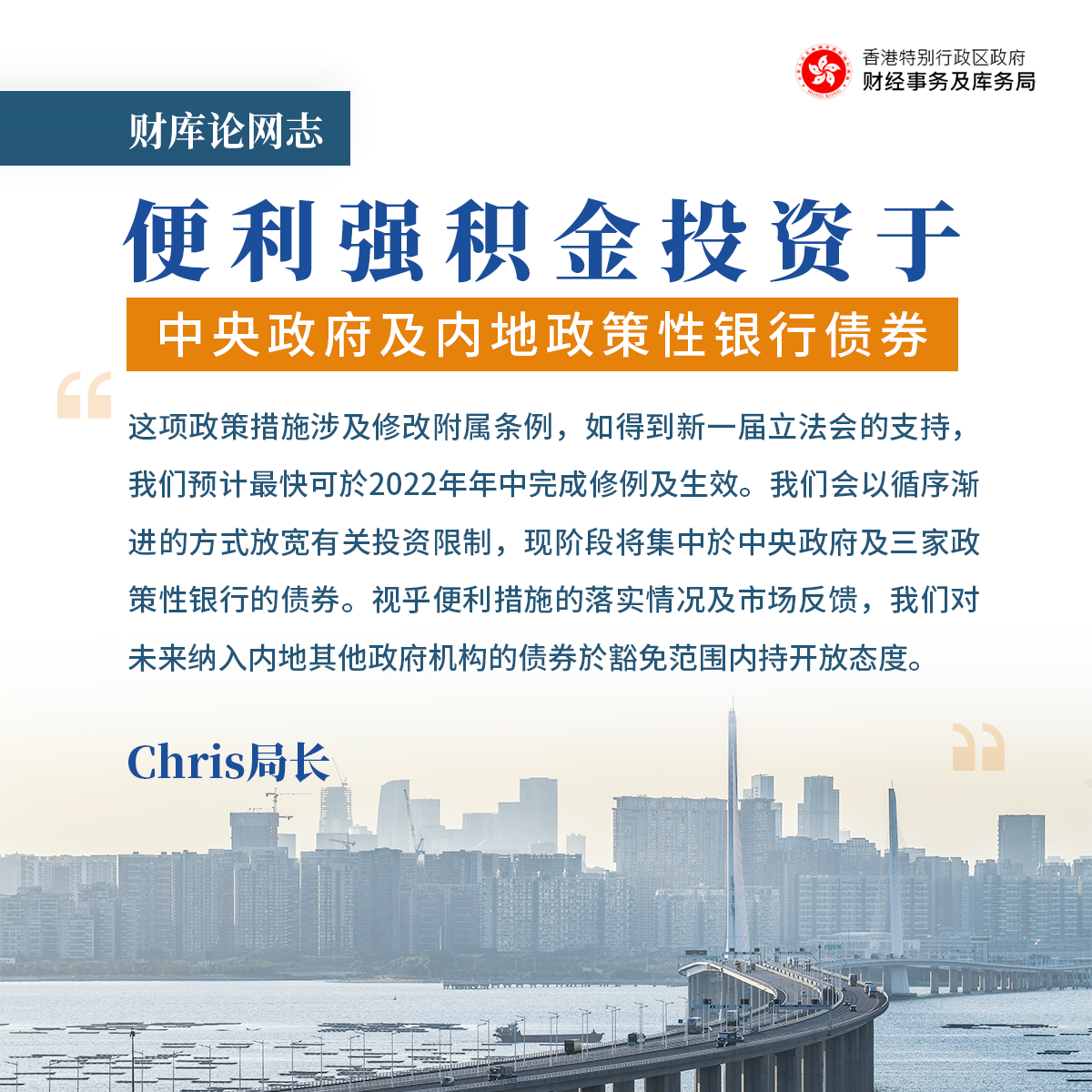继早前行政长官于《2021年施政报告》中宣布,将研究措施便利强积金投资于中央政府及内地政策性银行债券,财库局及积金局已完成相关研究,就此向大家介绍实施方案及时间表。