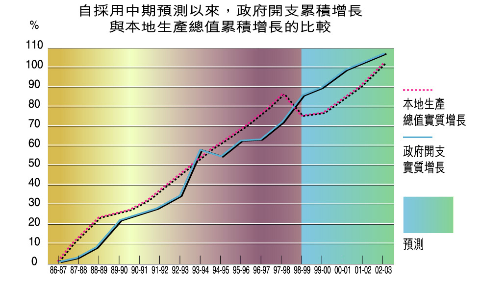 | 多年來,我們一直確保政府開支與本地生產總值的增長率相適應。不過,在一九九八至九九年度,甚至中期預測所涵蓋的整個時段,政府開支都會超逾本地生產總值的增長。這是由於經濟逆轉期間,政府繼續增加開支以應付社會需求所致。在一九九八至九九年度,經濟收縮了5.1%,而開支則預計增加5%。至於一九九九至二零零零年度,預測經濟會輕微增長0.5%,