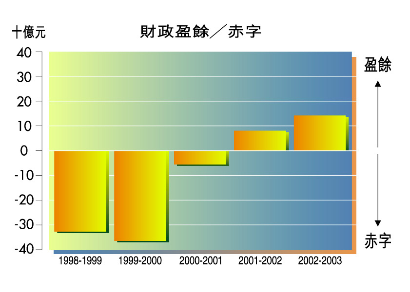 由於我們決定繼續增加政府開支,以免使經濟進一步衰退,並決定避免大幅加稅,好讓工商界和市民不致百上加斤,因此在短期內出現財政赤字是無可避免的。圖2展示在一九九九至二零零零年預算案中估計的中期預測財政狀況。