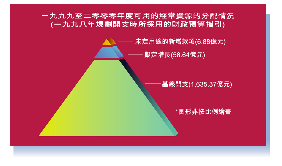 「資源增值計劃」的短期目標,是在二零零二至零三年度,把經常基線開支減少5%。大家也許並不知道基線開支其實佔政府經常開支總額相當大的部分。基線開支是指應付現行工作所需的經常資源。基線開支逐年累積,其中可能有把資源投放在已不大切合時宜和非社會上需優先處理的事項,也可能包括以過時的方式執行的工作。如圖3所示,根據一九九八年規劃開支時所採用的財政預算指引,一九九九至二零零零年度的基線開支,佔該年度可用經常資源總額的96%。倘若我們能夠節省金字塔面積龐大的底部(即基線開支)的款項,即使僅僅1%,款額已達16.35億元,較每年資源分配工作可撥予新增服務的款項總額,多出超過一倍。
