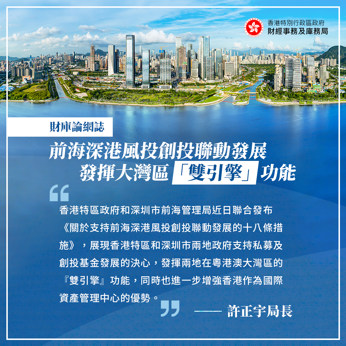 香港特區政府和深圳市前海管理局近日聯合發布《關於支持前海深港風投創投聯動發展的十八條措施》,展現香港特區和深圳市兩地政府支持私募及創投基金發展的決心,發揮兩地在粵港澳大灣區的「雙引擎」功能,同時也進一步增強香港作為國際資產管理中心的優勢。