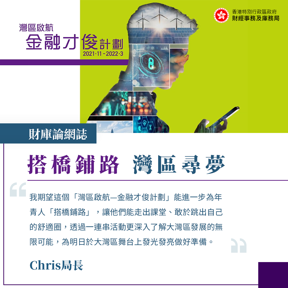 自《粵港澳大灣區發展規劃綱要》於2019年2月公布以來,大灣區的發展一日千里,區內的互聯互通越趨緊密,對於金融、專業服務及科技等各方面的人才需求也日益增加。財庫局在積極培育及充實本地人才庫的同時,亦致力為我們的年青人提供更多放眼及探索大灣區的機會,讓他們裝備自己,為日後在大灣區金融職途發展鋪路。