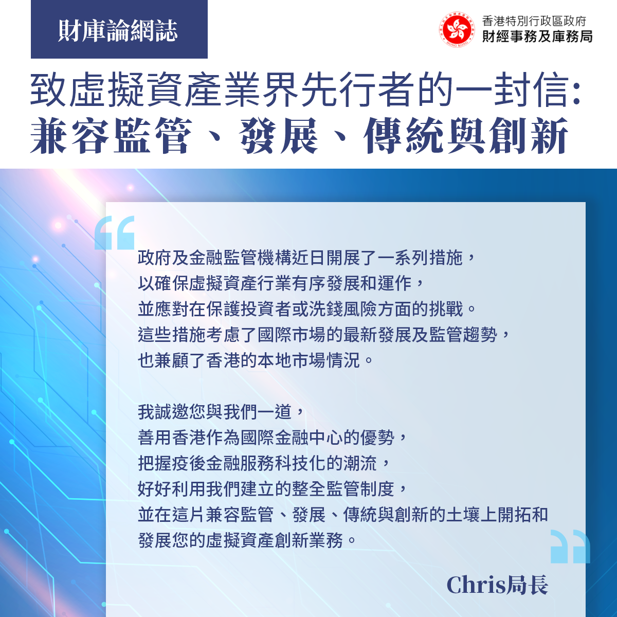 近年來,虛擬資產行業在全球發展迅速,市值大幅增長,參與的機構及投資者數目也日益增加。作為國際金融中心,香港吸引了許多虛擬資產領域的人才和初創企業落戶。虛擬資產及其背後的技術包括區塊鏈等,在金融創新方面帶來很多潛在機遇。同時,對於這新領域,設立一套整全監管體系,建立市場信心以開拓一條可持續發展路徑十分重要。就此,政府及金融監管機構近日開展了一系列措施,以確保虛擬資產行業有序發展和運作,並應對在保護投資者或洗錢風險方面的挑戰。這些措施考慮了國際市場的最新發展及監管趨勢,也兼顧了香港的本地市場情況,分別1)將為虛擬資產服務提供者設立發牌制度;2)考慮對用作支付用途的「穩定幣」作出監管;及3)為傳統金融機構向客戶提供虛擬資產相關服務提供指引。我希望在此向大家介紹我們這套兼容監管、發展、傳統與創新的計劃。
