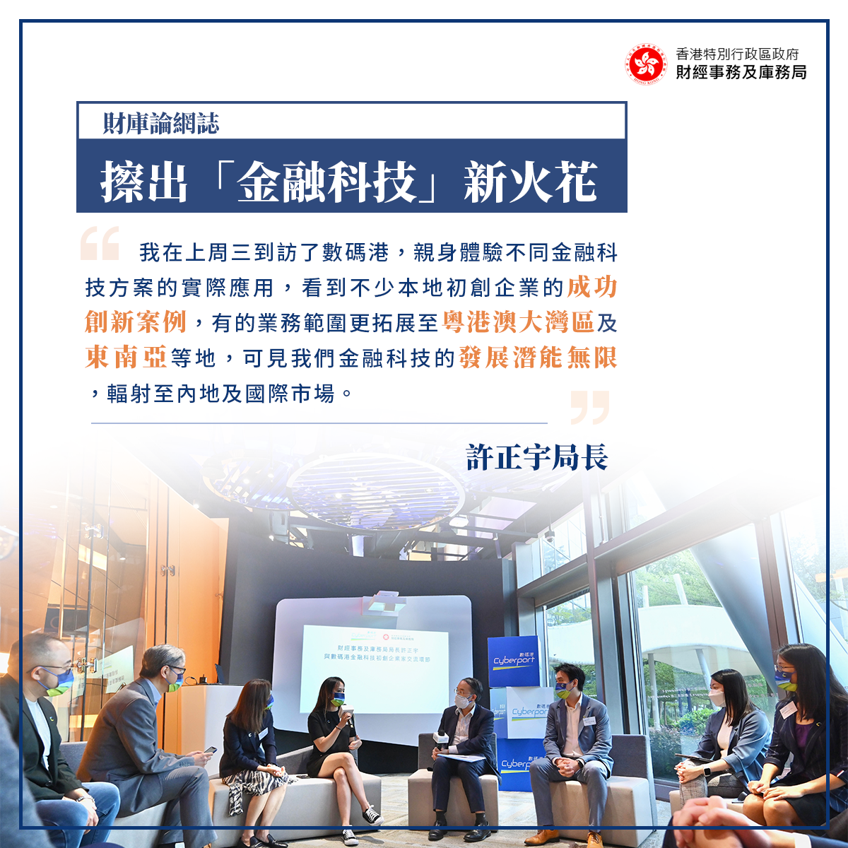我在上周三到訪了數碼港,親身體驗不同金融科技方案的實際應用,看到不少本地初創企業的成功創新案例,有的業務範圍更拓展至粵港澳大灣區及東南亞等地,可見我們金融科技的發展潛能無限,輻射至內地及國際市場。我即日亦公布了財庫局兩項發展金融科技的最新計劃,分別是新一輪「拍住上」金融科技概念驗證測試資助計劃和金融科技從業員培訓資助先導計劃,如下:
