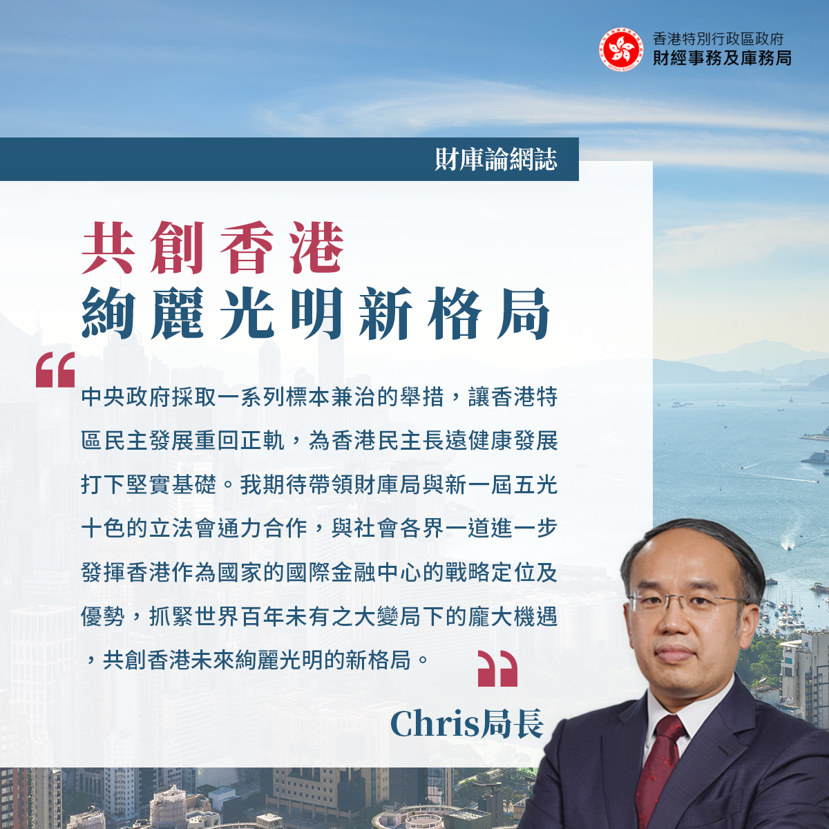 第七屆立法會選舉是發展具香港特色民主制度的完整體現,具有廣泛代表性、政治包容性、均衡參與性和公平競爭性,候選人以紮實的理念及政策建議盡力爭取廣泛支持。我對每一位候選人投入的努力致上敬意,同時衷心祝賀當選的90位立法會議員。各位在完善特區選舉制度後的首場立法會選舉中當選,承載的是廣大市民對香港開啟良政善治新篇章的期盼,意義非凡而深遠。中央政府採取一系列標本兼治的舉措,讓香港特區民主發展重回正軌,為香港民主長遠健康發展打下堅實基礎。我期待帶領財庫局與新一屆五光十色的立法會通力合作,與社會各界一道進一步發揮香港作為國家的國際金融中心的戰略定位及優勢,抓緊世界百年未有之大變局下的龐大機遇,共創香港未來絢麗光明的新格局。