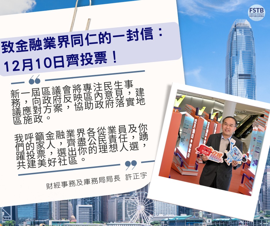 今屆區議會地方選區的投票時間為12月10日早上8時30分至晚上10時30分。我呼籲金融業界各從業員及你們的家人,齊盡公民責任,踴躍投票,選出你的理想人選,共建美好社區。