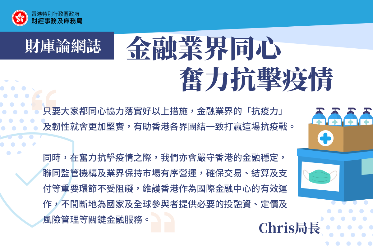 我深信香港穩固的根基及國家的支持將讓我們在疫後再展光彩,成為更具競爭力和更具能量的國際金融中心。讓我們金融業界一起堅定信心,團結一致打贏這場抗疫戰!