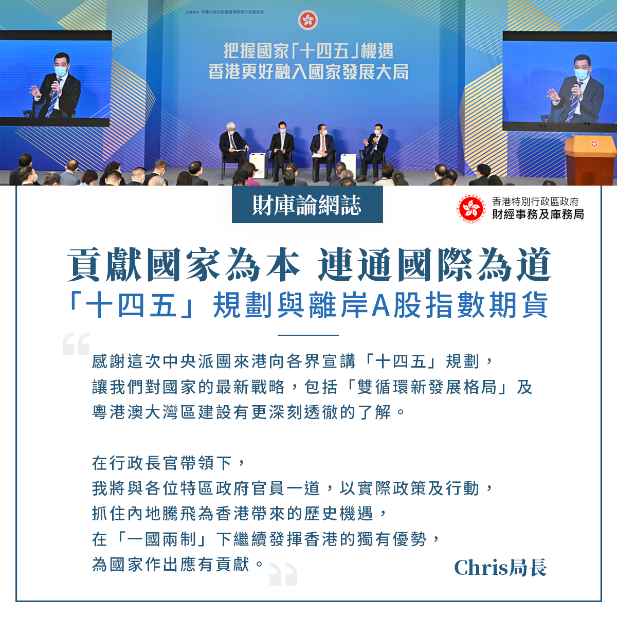 「十四五」規劃是中央政府深入研判國內外最新形勢,為了向第二個百年奮鬥目標邁進而提出的宏偉藍圖。本著對香港的關懷之心,中央政府在規劃內對香港的發展前景指明了道路,給我們的未來帶來了無限機遇。感謝這次中央派團來港向各界宣講「十四五」規劃,讓我們對國家的最新戰略,包括「雙循環新發展格局」及粵港澳大灣區建設有更深刻透徹的了解。在行政長官帶領下,我將與各位特區政府官員一道,以實際政策及行動,抓住內地騰飛為香港帶來的歷史機遇,在「一國兩制」下繼續發揮香港的獨有優勢,為國家作出應有貢獻。